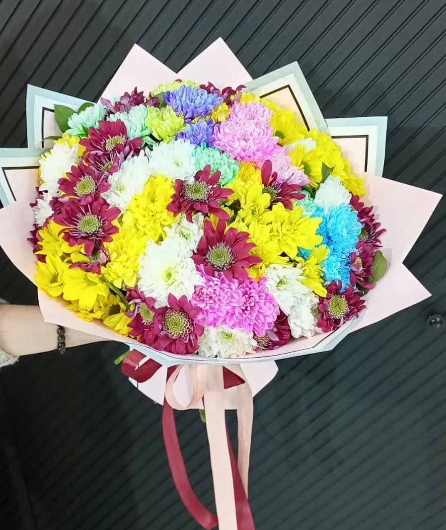 Состав букета: разноцветные хризантемы, упаковка, лента