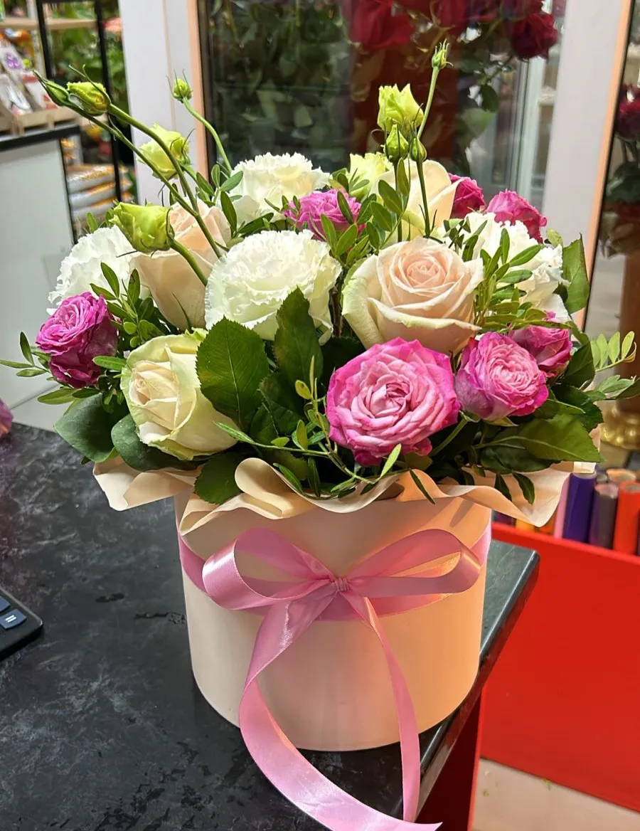 Шляпная коробка, наполненная нежными кустовыми розами, изящными белыми розами и эустомой, представляет собой настоящую симфонию красоты и изысканности. Каждое растение в этой композиции словно рассказывает свою историю, создавая гармоничное сочетание цвета и формы.