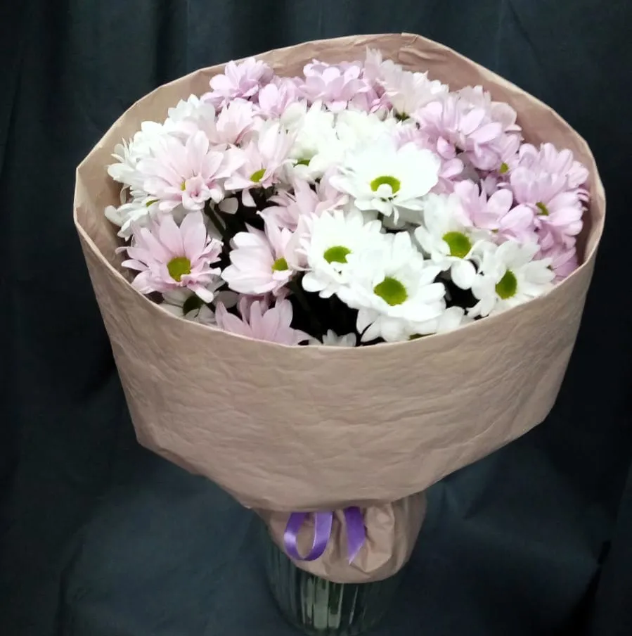 Состав букета- кустовые хризантемы - 7 шт.,упаковка,лента