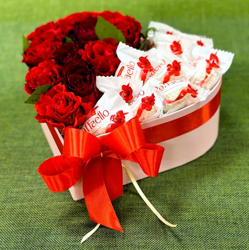 Шляпная коробка в виде сердца — это не только изысканный подарок, но и символ истинной любви и заботы. Наполненная свежими розами, она создает неповторимую атмосферу романтики и нежности. Розы, олицетворяющие страсть и восхищение, прекрасно дополняются изысканными сладостями Rafaello, которые добавляют моменту особую сладость и тепло.