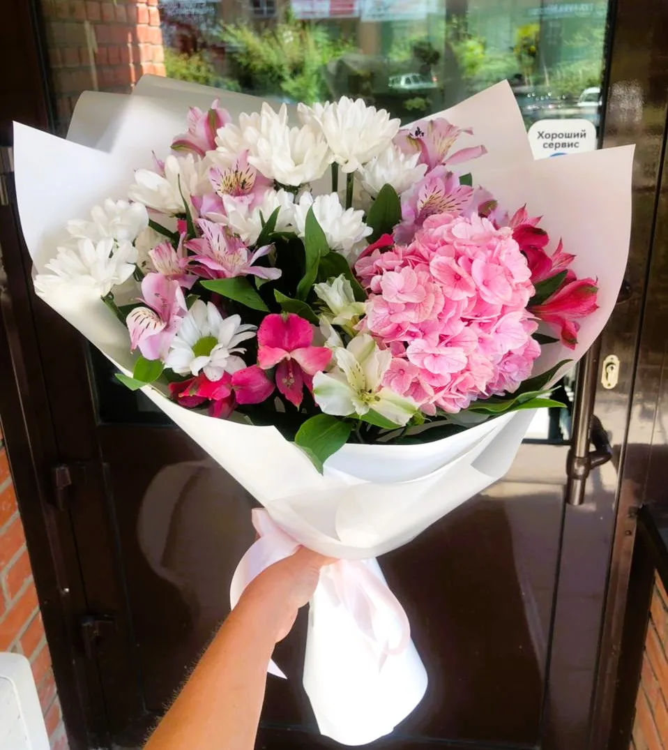 Букет из гортензий, альстромерий и ромашковых хризантем – это настоящий праздник для глаз и души. Пышные, бархатистые соцветия гортензий создают объем и глубину, переливаясь нежными оттенками ярко-розового. Они словно закутывают в себя нежность и романтику.