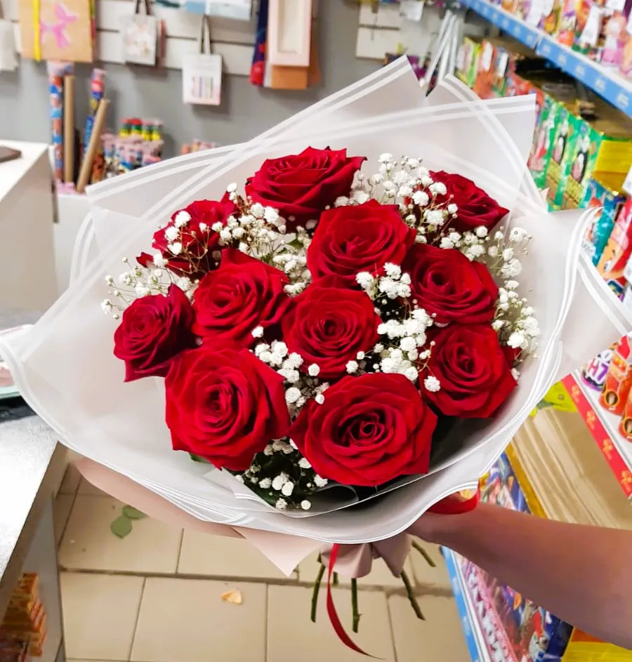Букет из красных роз и белой гипсофилы — это воплощение элегантности и романтики. Яркие алые розы, символизирующие любовь и страсть, прекрасно контрастируют с нежными облачками белой гипсофилы, которые добавляют легкости и воздушности.