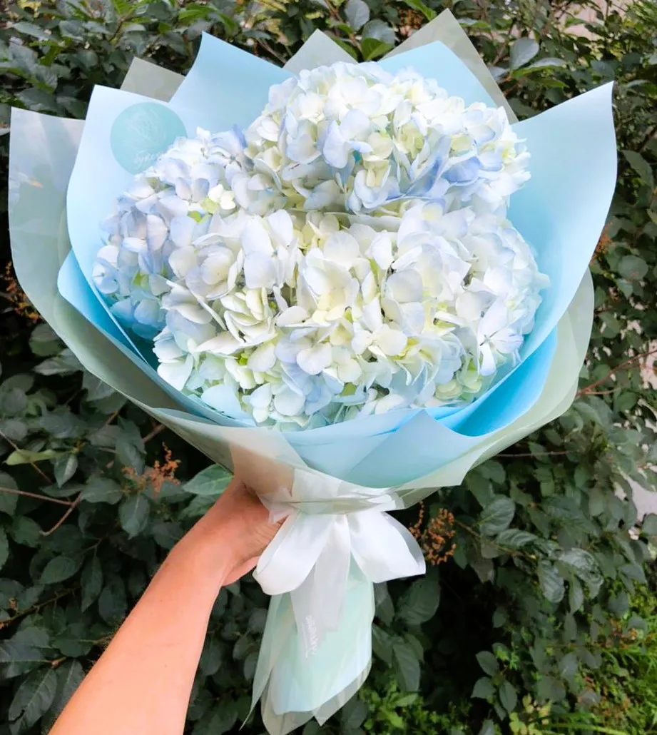 Букет из голубых гортензий – это настоящее воплощение нежности и изящества. Пухлые соцветия, словно облака, гордо возвышаются на стеблях, радуя глаз своей утонченной красотой. Их мягкий, прохладный оттенок варьируется от нежно-голубого до глубокого индиго, создавая впечатление легкости и воздушности.