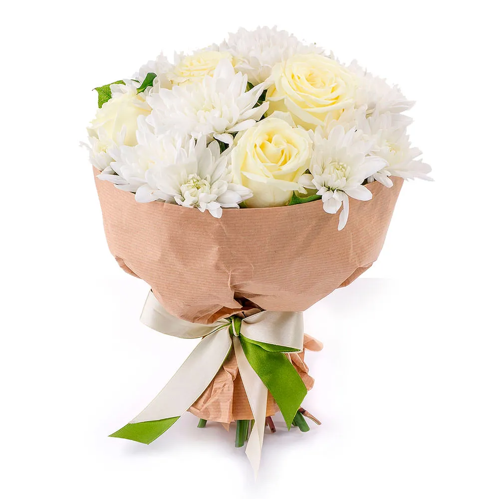 • Стандарт - роза - 5 шт., хризантема - 2 шт., упаковка, лента