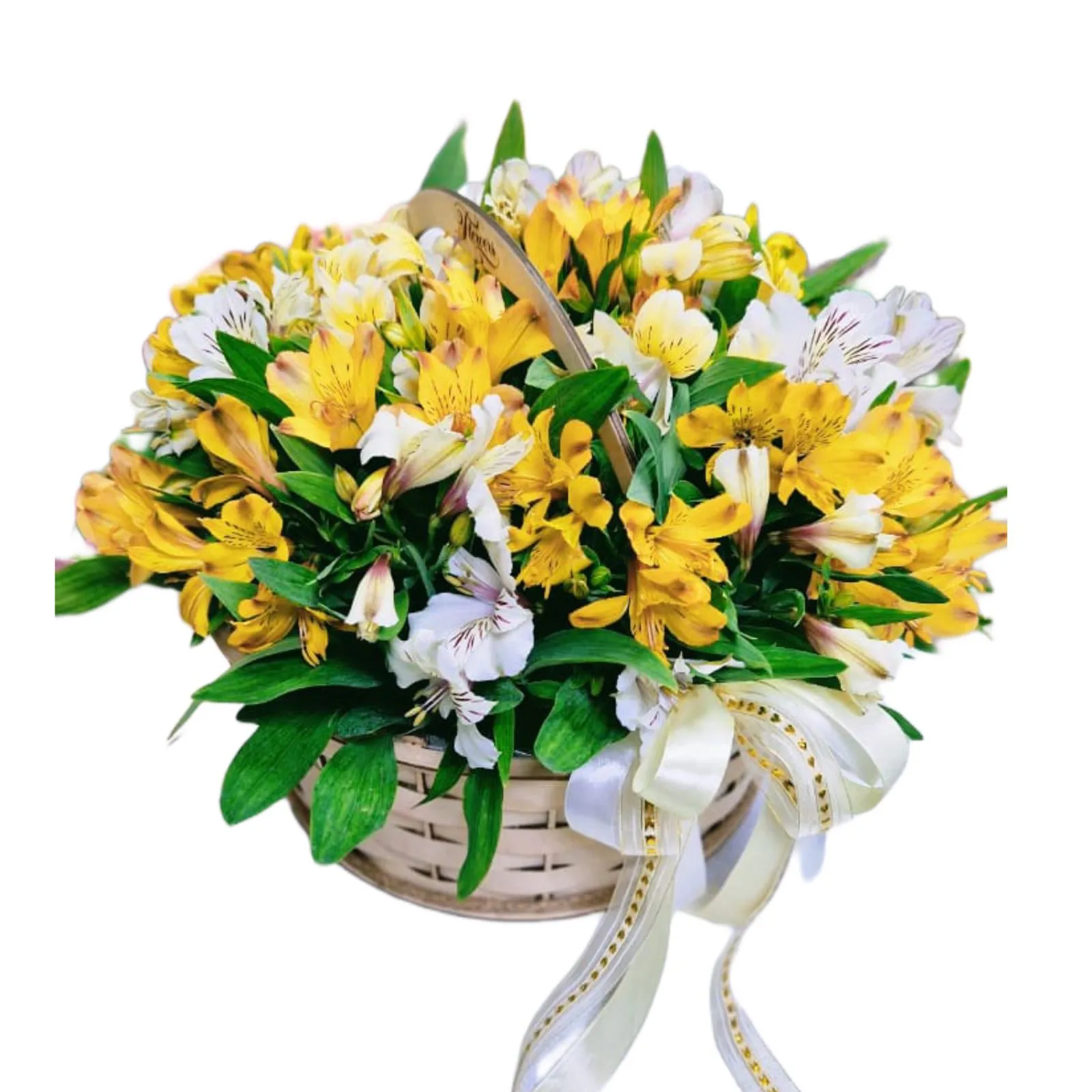 • Премиум - альстромерия - 31 шт., декоративная зелень, оазис, корзина
