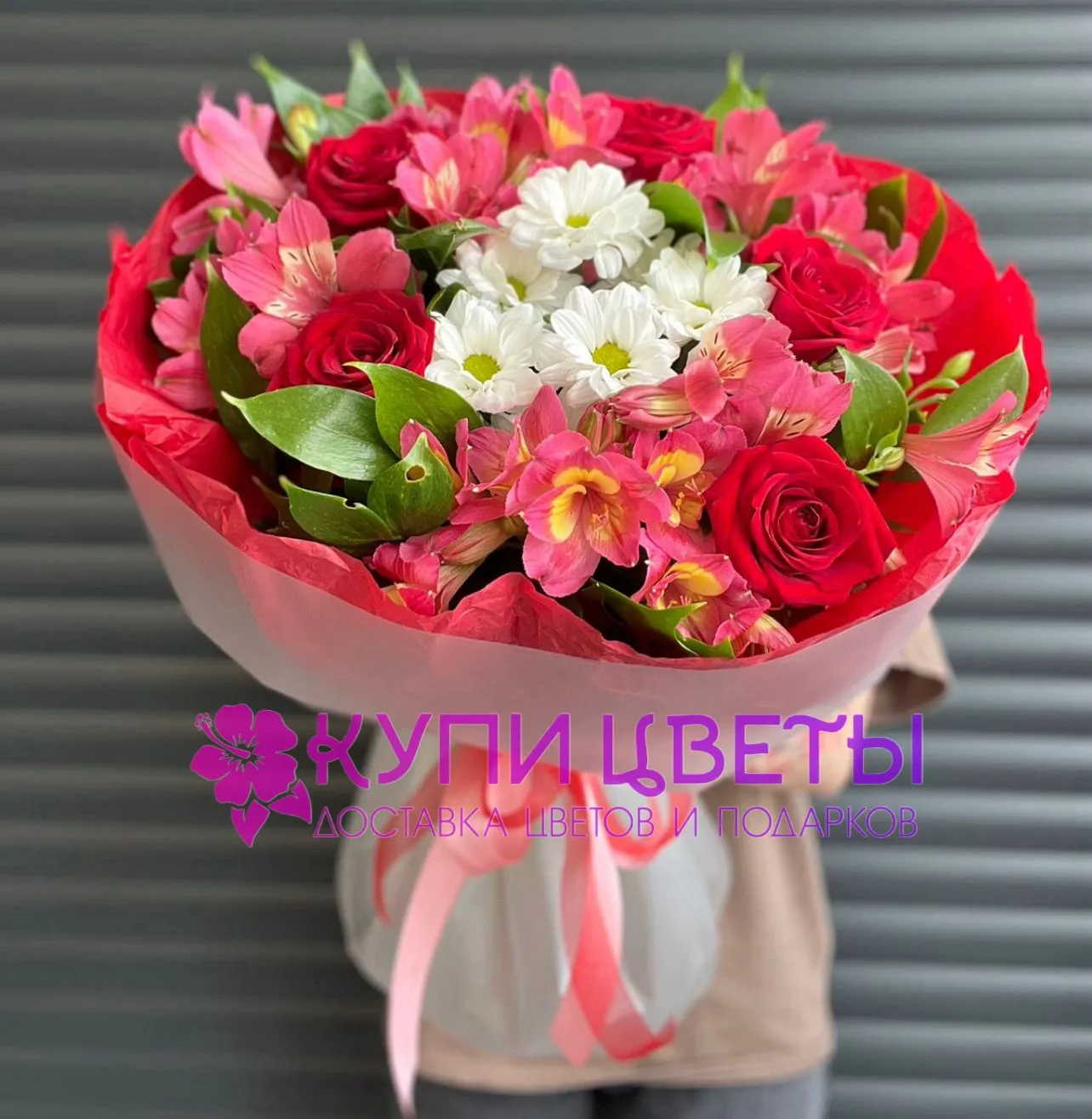 Хризантема, альстромеhия, розы, упаковка, лента,