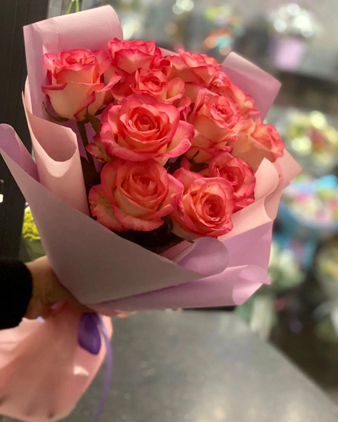 Состав букета: розовые розы, упаковка, лента