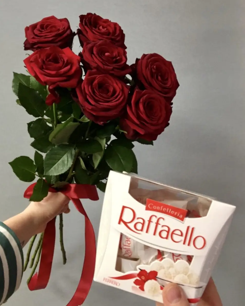 роза-7шт, лента + рафаэлло