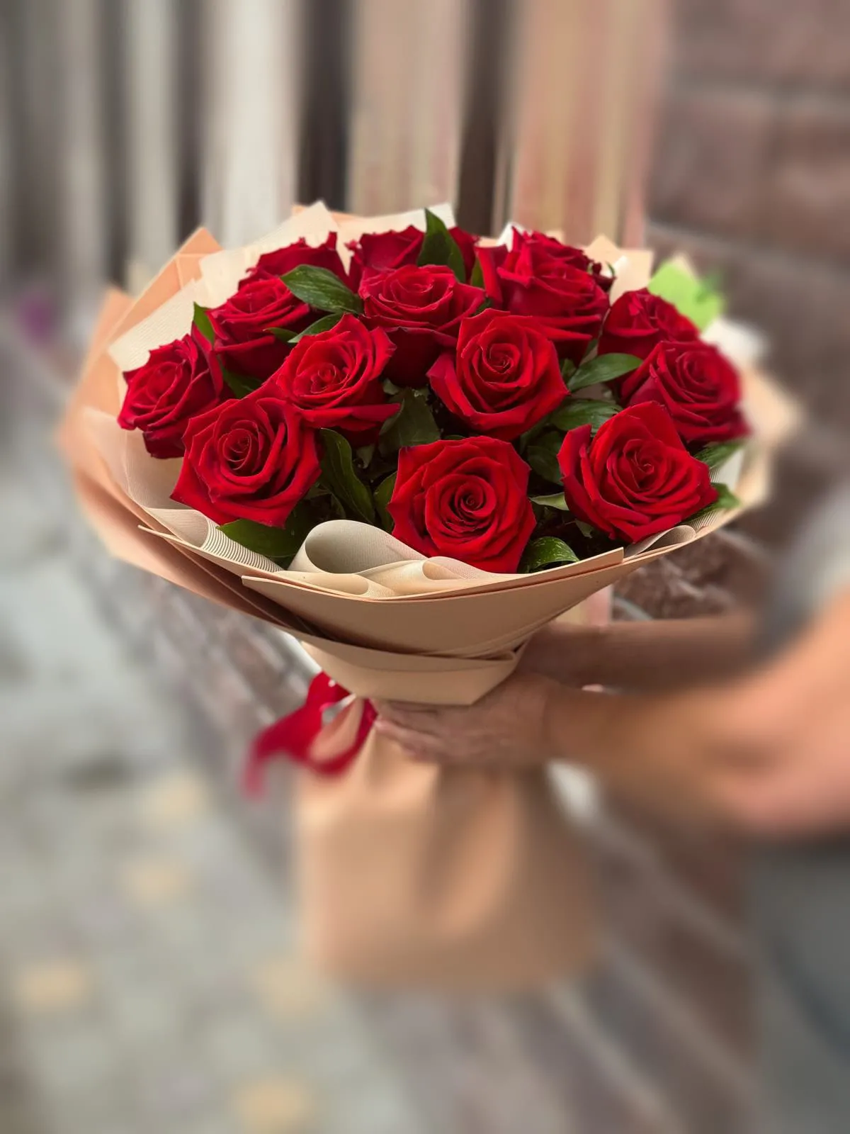 Каждая роза восхищает своим насыщенным цветом, оттенки которого колеблются от глубокого бордового до ярко-красного. Лепестки, словно бархат, нежно блестят на свету, даря ощущение роскоши и свежести.