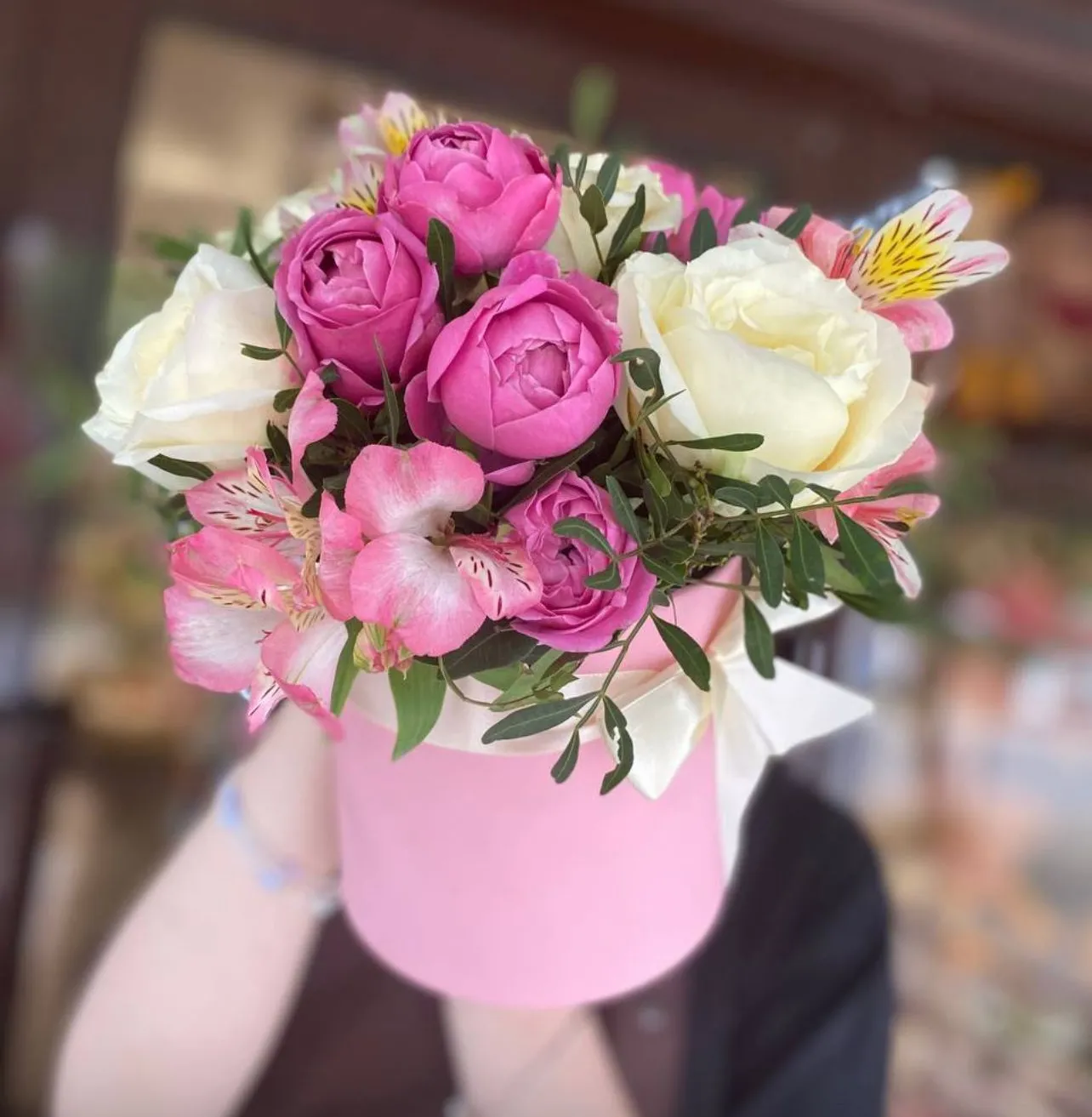 Перед вами – изысканная симфония нежности, очарования и тонкой элегантности, заключенная в стильную шляпную коробку. Эта композиция – это ода красоте, воплощенная в самых романтичных оттенках.