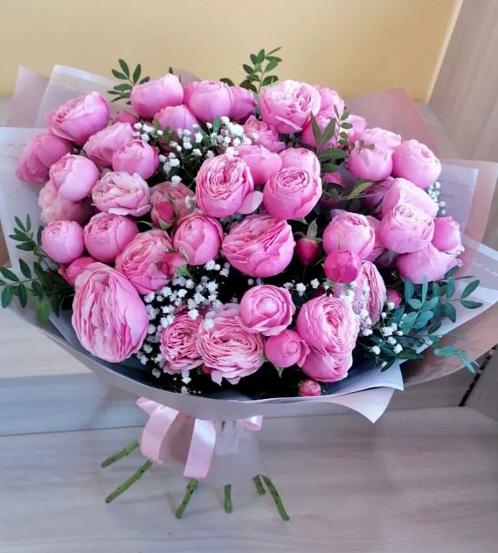 Пионовидная кустовая роза, гипсофила, упаковка, лента