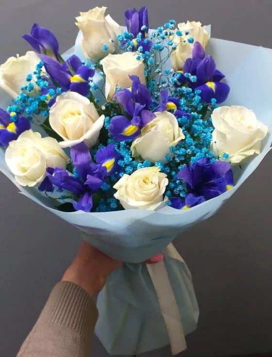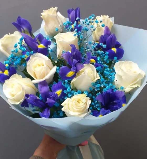 Позвольте представить вам волшебное сочетание, где нежность и элегантность сплетаются в едином дыхании - букет из ирисов и  белых роз.